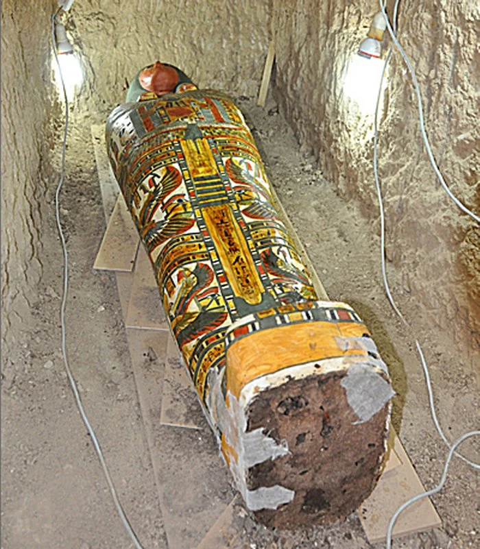 The mummy was found wrapped in linen and plaster then placed in a wooden sarcophagus which has been decorated with special images of goddesses Isis and Nephtys that display their wings alongside the four sons of Horus.