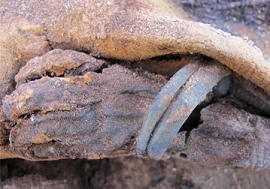 Discovered in 2014, the mummy is an unidentified 18 month old child. The infant was found in the Fag el-Gamous (translated to "Way of the Water Buffalo") burial site. This burial was alongside a blond woman, presumably her mother.