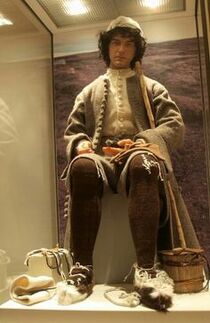 He carried a horn spoon and a wooden handled knife with an iron blade. He wore hide shoes over his heavily-patched socks