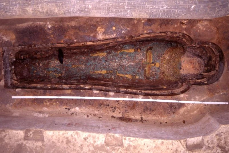 Inside the chamber was a limestone sarcophagus with 408 faience ushabtis (servants for the next world) around the base. Other artifacts in the chamber induced wooden furniture, pottery and papyrus scrolls. The walls of the tomb and sarcophagus were covered with texts from the Book of the Dead.
