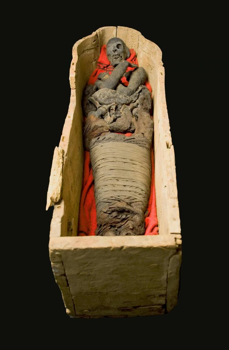 The mummy is missing most of the torso and feet, and much of what remains has been unwrapped.