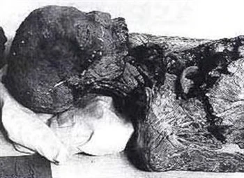 The mummy was reasonably well preserved when it was discovered. Some of the upper front teeth were missing, as well as the lower mandible. The chest of the mummy was smashed in by tomb-robbers who were looking for some valuables. The head was torn loose from the body. The arms of the mummy are stretched out along the body and, curiously, both feet are spayed outwardly. The fact that his feet were displayed like this could mean multiple things. Either, it could of been a deformity that the subject suffered in life, or they could have been placed this way by the embalmers. It could also have just been laid in such a manner by its discoverers prior to it being photographed. The cause has not been determined.