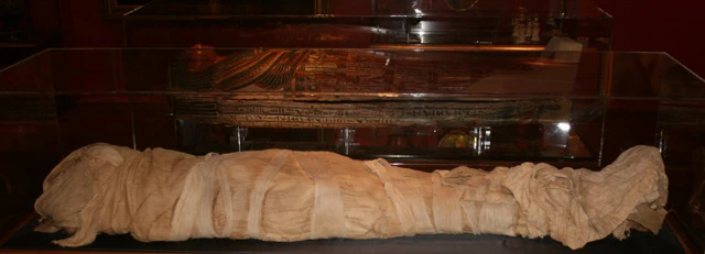 The mummy has been examined by inserting an endoscope into the body cavity and samples have been taken from the area between the ribs and around the pelvic region. The examination of the body reveals that in ancient times an incision had been made in the left-hand side of the abdomen and once the organs had been removed it was then packed with linen. The internal cavity of the body appeared to be blackened – due to the resin used to mummify the body.