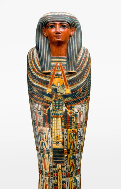 Egyptian wooden coffin of the man Padiashaikhet containing mummified human remains, dated to the 25th Dynasty (720BC-200BC), in the Nicholson Museum. The coffin is carved from a single piece wood, then gessoed and painted. It takes the shape of the human male figure, with a brown painted face wearing a striped tripartite wig. The lid is divided into zones across the body featuring panels of various gods.The name of the owner of the coffin, Padiashaikhet, is inscribed in painted hieroglyphs along with his titles. The base of the coffin is painted with an excerpt from the Book of the Dead and below the text is the image of the Amentet, ‘Lady of the West’, who is depicted with wings and a distinctive headdress. The mummified remains associated with this coffin is wrapped in a linen shroud which has been held in place loosely by a few strips of linen around the body.